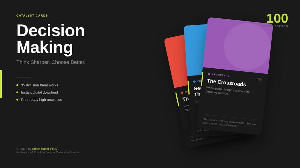 Created by Steph Hamill, Professor of Practice at Vogue College, Fellow of the Royal Society of Arts, Creativity and Innovation Business Consultant and former Group Creative Director who has advised Fortune 500 brands and personally mentor 300+ startup and scale-up founders, these cards distill decades of decision science into a tool you can use in minutes.